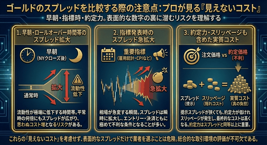 ゴールドは値動きが激しいため、「スプレッド+約定力」という視点で業者を評価する必要があります。