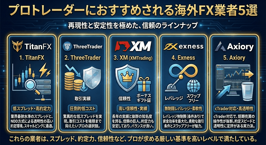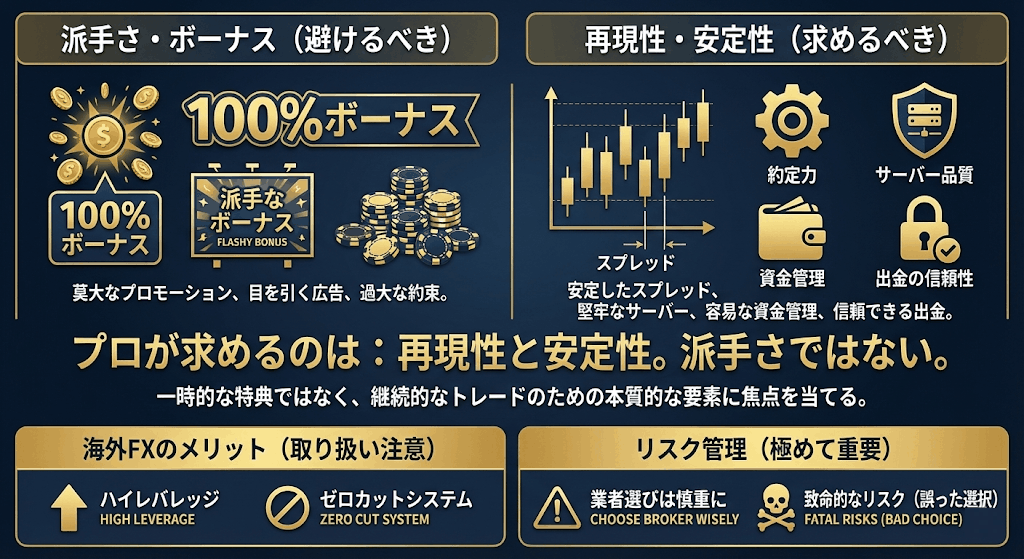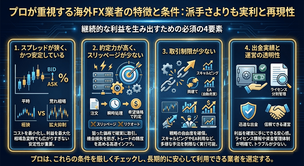プロトレーダーが海外FX業者を選ぶ際に重視するのは、ボーナスや広告の派手さではありません。